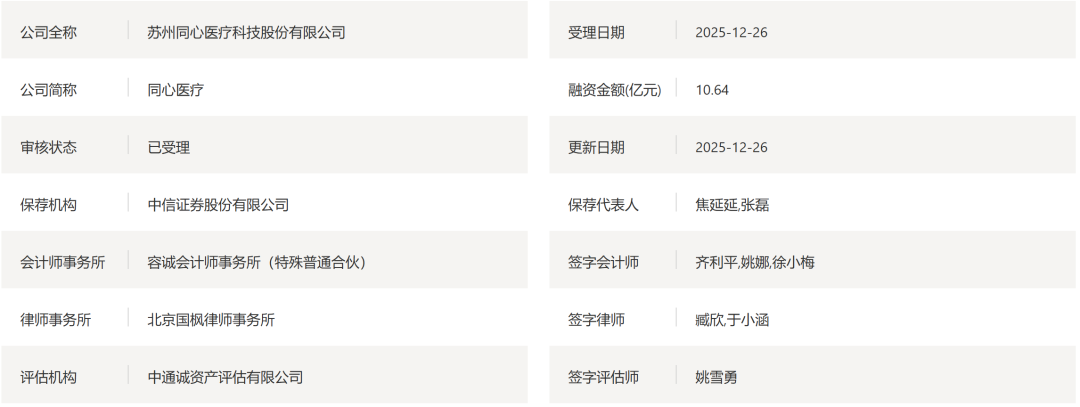 同心医疗是一家全球性的、以突破性新技术和解决方案推动晚期心力衰竭治疗进步和市场发展的创新医疗器械公司。公司的主要产品为植入式左心室辅助系统(即通常所称的人工心脏,简称LVAD),用于部分或全部替代左心室完成泵血功能,从而达到卸载天然心脏负荷的效果,弥补心脏泵血能力不足的同时促进心脏功能恢复。保荐机构中信证券,会所容诚,律所北京国枫。