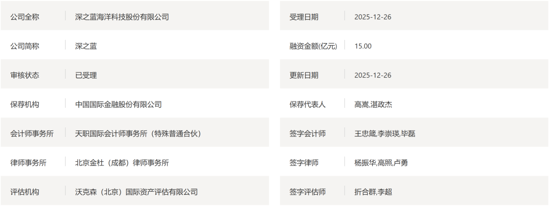 公司主营业务为缆控水下机器人、自主水下航行器、水下滑翔机、自动剖面浮标和水下助推机器人等产品的研发、生产、销售和服务。保荐机构中金公司,会所天职国际,律所北京金杜。
