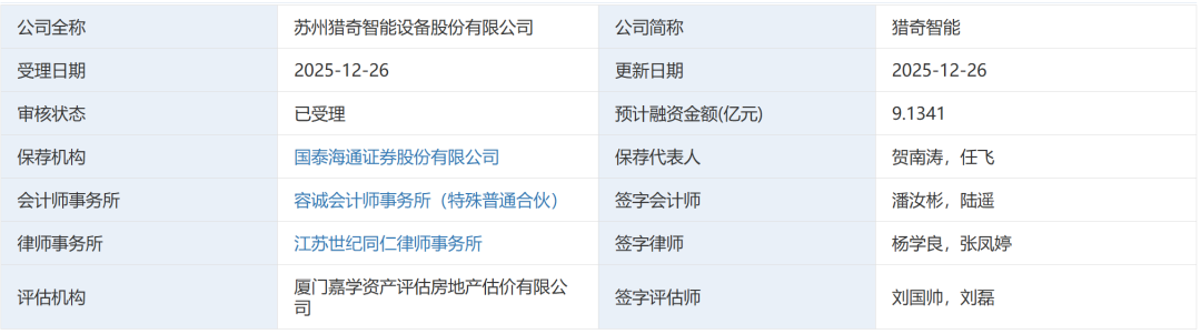 公司主要从事光通信、半导体、汽车自动化等领域智能生产装备的研发、生产和销售,是国内光模块智能制造装备的主要供应商之一,公司产品已覆盖光模块封装测试的核心环节,包括贴片、耦合、老化测试等关键工序。保荐机构国泰海通,会所容诚,律所江苏世纪同仁。