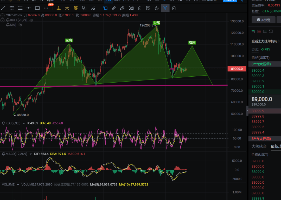 目前的比特币走势依旧在我们判断的区间里面运行,价格还在头肩顶的形态意愿运行,没有偏离导航我们继续等待这个位置的出现就可以,85000-92800低多高空进行