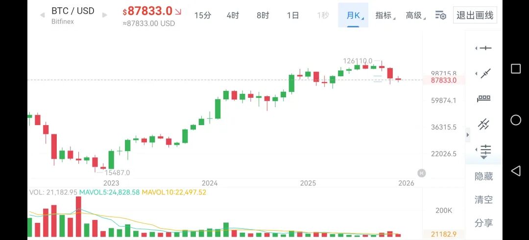 比特币依旧在 85000 美元附近徘徊,市场恐慌情绪仍然属于极度恐慌,当时我们通过月 K 线分析,比特币在牛市高位,行情月线三连阴属于历史小概率事件。