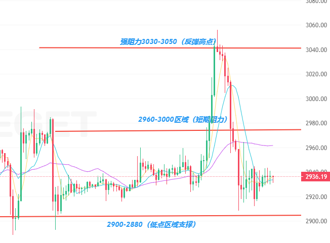 技术形态同样呈现 “区间承压” 特征:日线级别:价格长期围绕 2900-3000 区间波动,2980-3000 区域抛压显著,多次冲高均未能站稳 2950 上方;MA5 与 MA10 均线粘合运行,无明确趋势方向,多空力量暂时均衡。小时线级别:RSI 指标在 48 左右徘徊,处于中性区域;MACD 指标在零轴下方缩量,虽有短暂反弹迹象,但动能较弱,难以推动价格突破关键阻力,短期仍以整理为主。