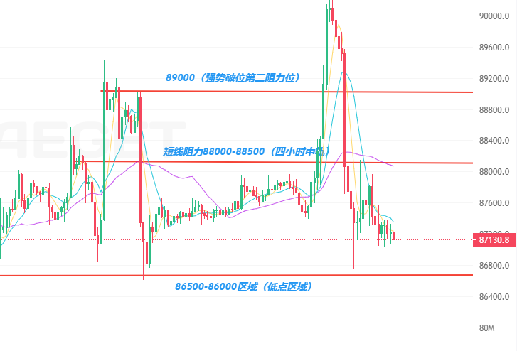 当前技术形态仍凸显 “弱势震荡” 特征:日线级别:价格被限制在 87000-89000 关键区间内,多次冲高均未能突破 89000 阻力位,且缩量走势表明反弹缺乏增量资金支撑;虽当前价格守住 90 天支撑位,但整体仍运行于短期 MA 均线下方,未改变阶段性偏空结构。小时线级别:RSI 指标维持在 45-50 中性区间,无明显超买或超卖信号;MACD 指标缩量运行,红柱幅度微弱,短期反弹动能匮乏,难以形成有效突破,大概率延续区间震荡。