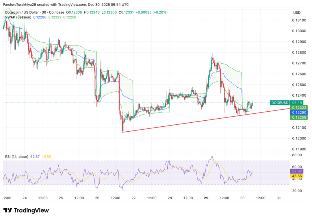 在更小周期上,狗狗币(DOGE)在上周快速下跌后,正在尝试稳住节奏。30 分钟级别图中,价格暂时维持在日内上升趋势线之上,并围绕 0.123 美元附近的成交量加权平均价(VWAP)运行。这说明短线资金在这里尝试护盘,但力度并不算强。