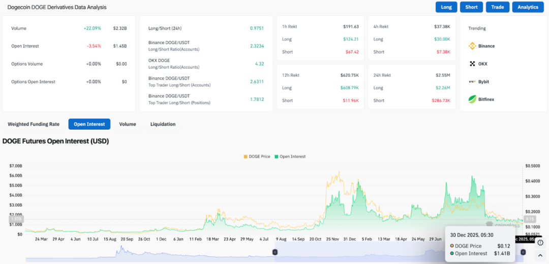 狗狗币今日价格在 0.123 美元附近震荡,在连续数周被资金抛压压制后,暂时守住了短期支撑位。日线图来看,价格依旧运行在下降通道内,空头仍然掌控节奏,临近 2025 年最后一个交易日,多头暂时还看不到明显扭转趋势的能力。