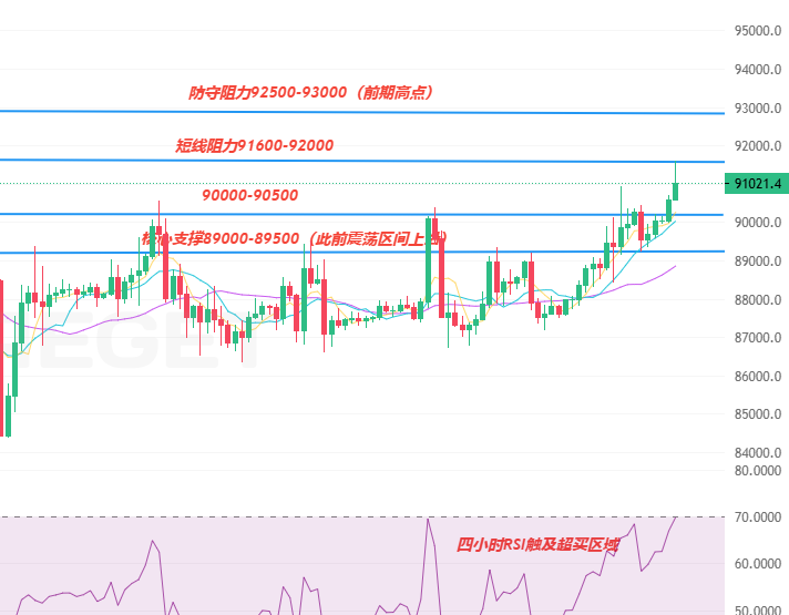 比特币在新年开启震荡上行格局:前期从 87000 附近一路稳步攀升,昨日最高触及 90926后,短暂回撤至 89261(昨日关键支撑位),随后迅速企稳并延续高位震荡;今日早间多头再度发力,价格最高冲至 91589 ,刷新新年以来高点,当前在 91100 附近整理,日内波幅约 2328 点,成交量较昨日同期放大 8%,市场做多情绪较年末明显回暖,但高位仍有谨慎观望情绪。