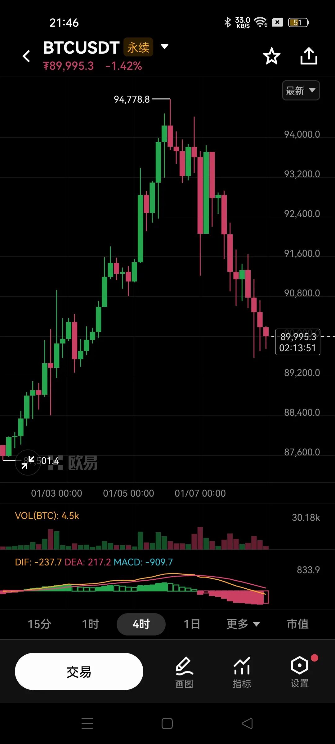 1. 高位回调趋势:图表显示,比特币在1月6日左右触及近期高点94,778.8 USDT(约合人民币94.8万元)后,未能延续上涨,转而进入明显的回调阶段。当前价格已回落至89,995.3 USDT,较高点下跌约5%。