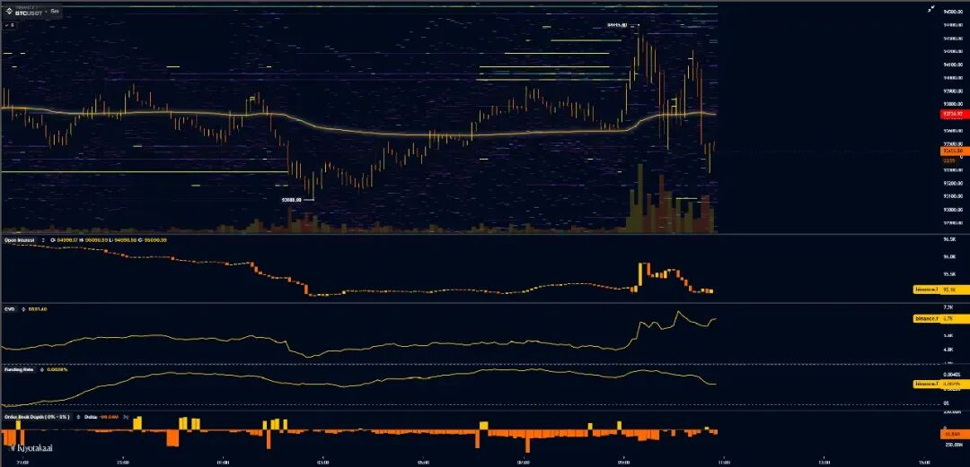 “多头在9.4万美元第二次附近觉察到这个细微信号后离场,仅留下尾盘空头开始建仓。通常这类日子衰减很大,” 他写道,同时附上了交易所订单簿数据图表。