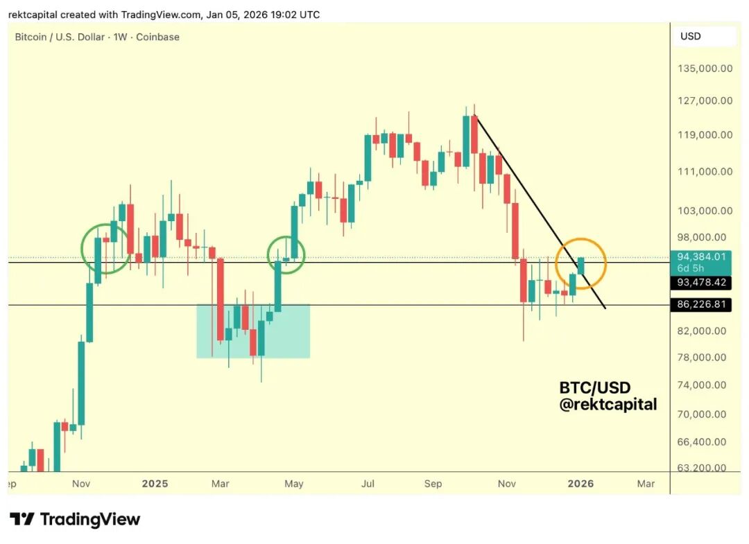 该交易对接下来需在即将收官的本周蜡烛高于93500美元区间上沿收盘,即2025年年初开盘价位。